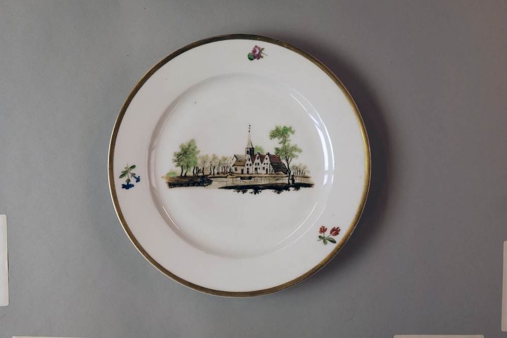 Bord met een afbeelding van een historisch dorpsgezicht of gebouw.- Trefwoorden