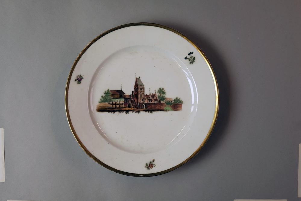 Bord met een afbeelding van een historisch dorpsgezicht of gebouw.- Trefwoorden