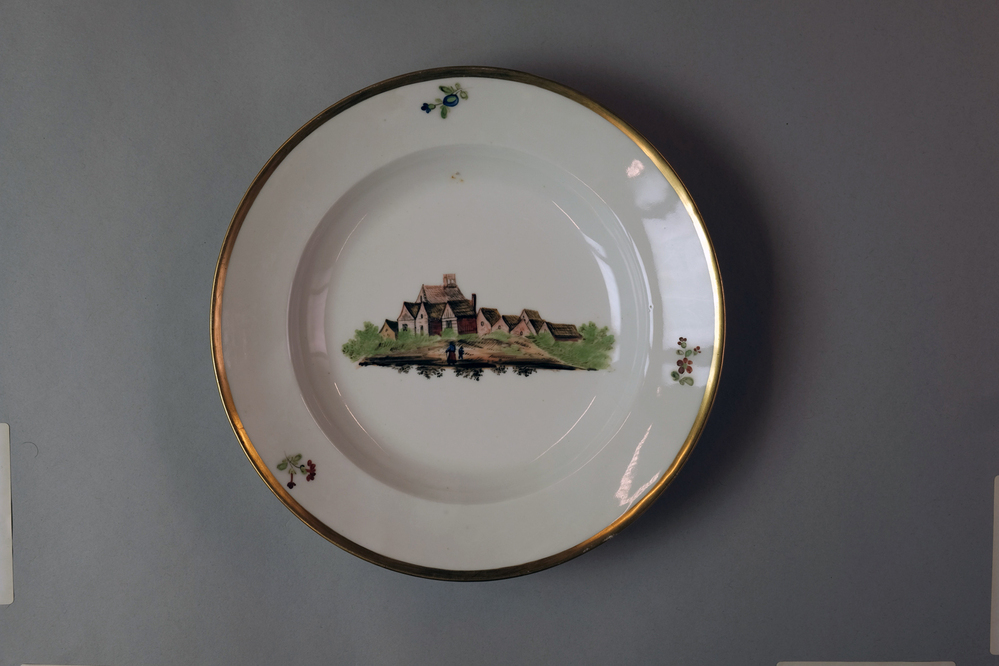 Diep bord met een afbeelding van een historisch dorpsgezicht of gebouw.- Trefwoorden
