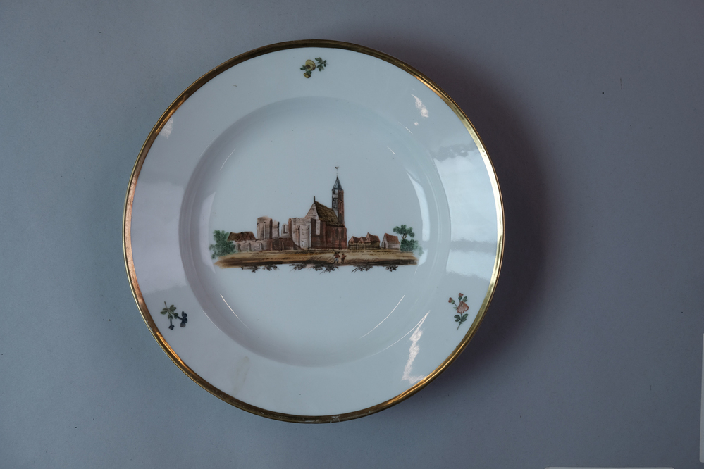 Diep bord met een afbeelding van een historisch dorpsgezicht of gebouw.- Trefwoorden