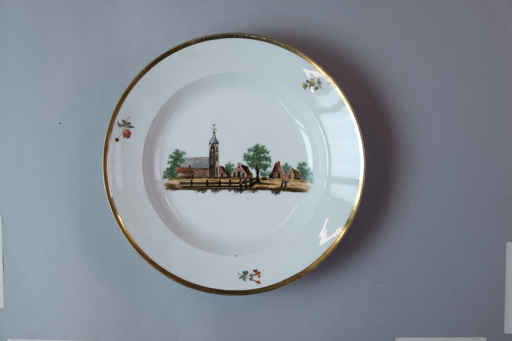 Diep bord met een afbeelding van een historisch dorpsgezicht of gebouw.- Trefwoorden