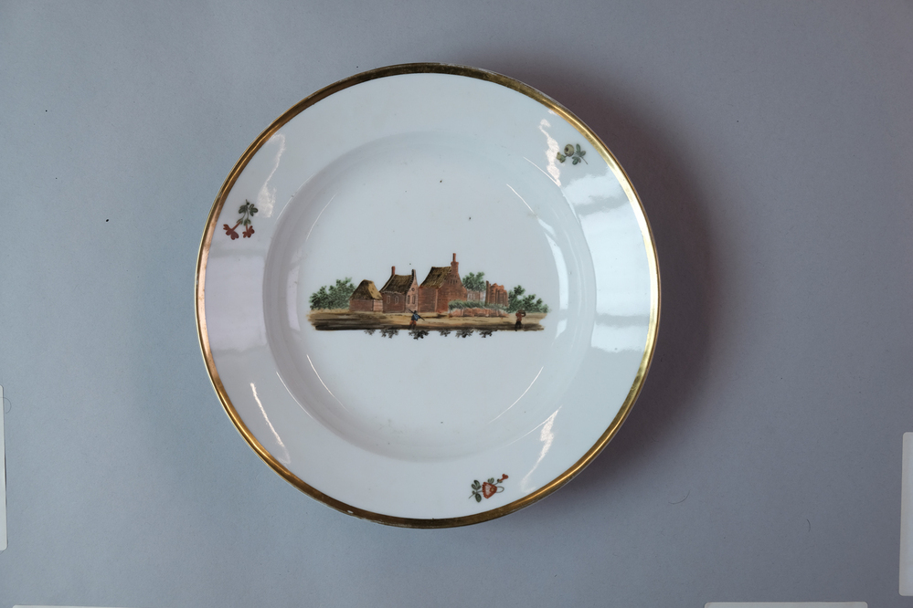 Diep bord met een afbeelding van een historisch dorpsgezicht of gebouw.- Trefwoorden