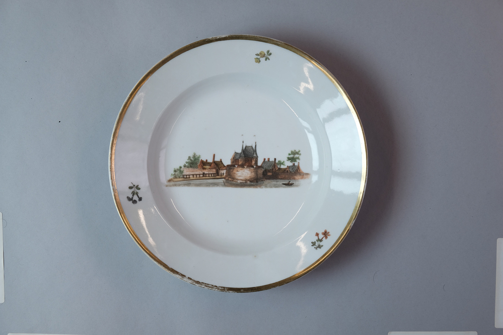 Diep bord met een afbeelding van een historisch dorpsgezicht of gebouw.- Trefwoorden
