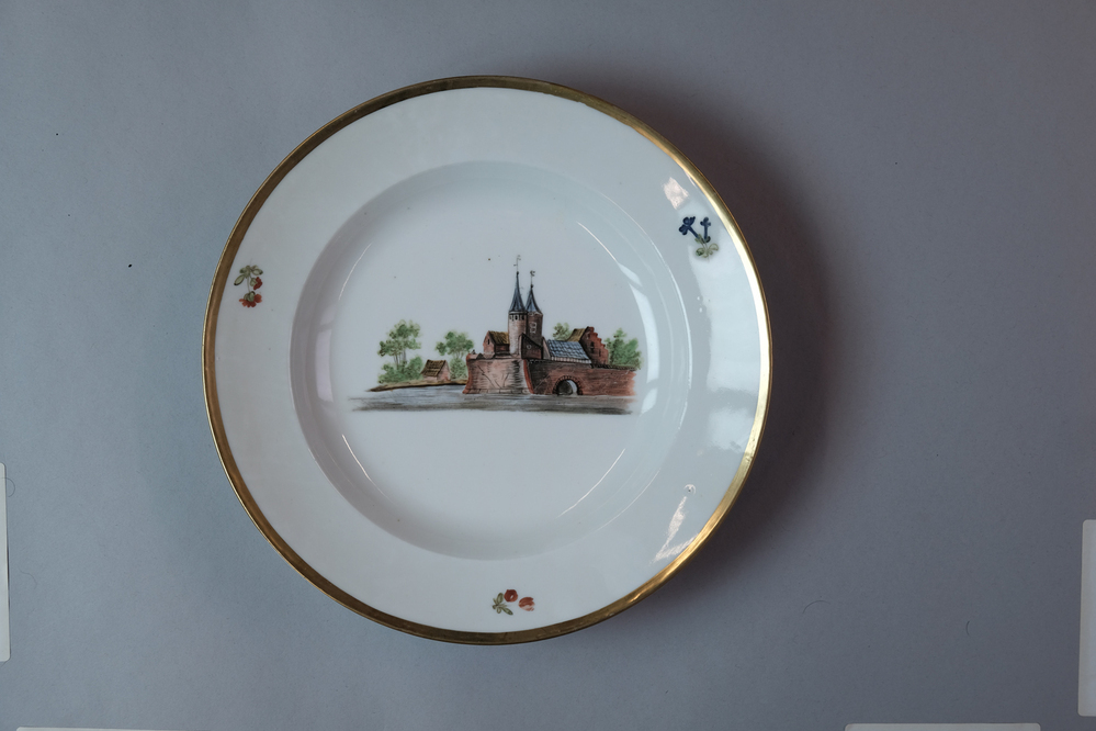 Diep bord met een afbeelding van een historisch dorpsgezicht of gebouw.- Trefwoorden