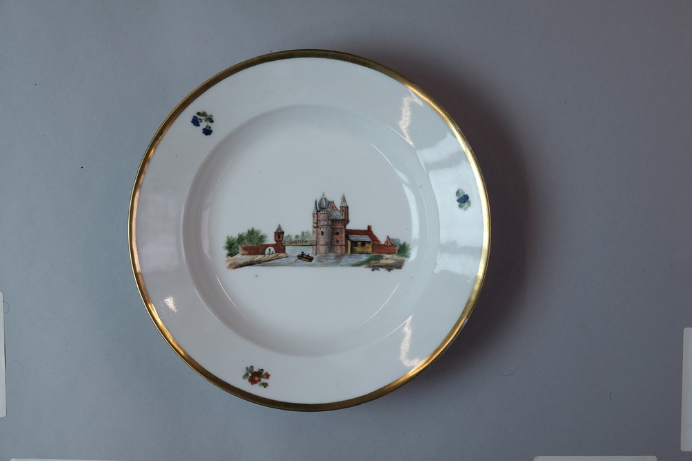 Diep bord met een afbeelding van een historisch dorpsgezicht of gebouw.- Trefwoorden