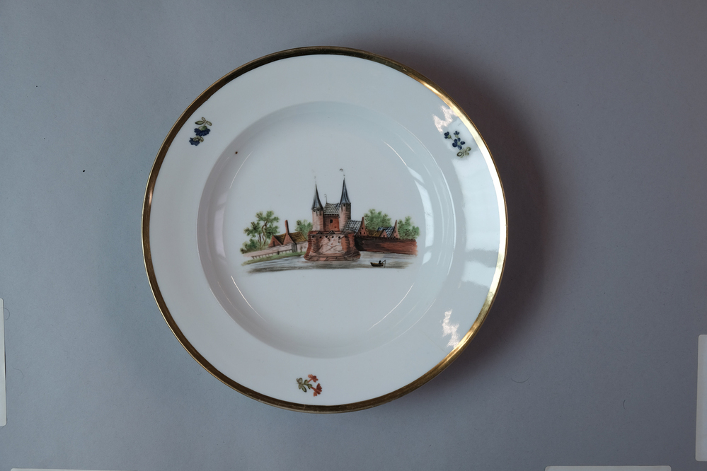 Diep bord met een afbeelding van een historisch dorpsgezicht of gebouw.- Trefwoorden
