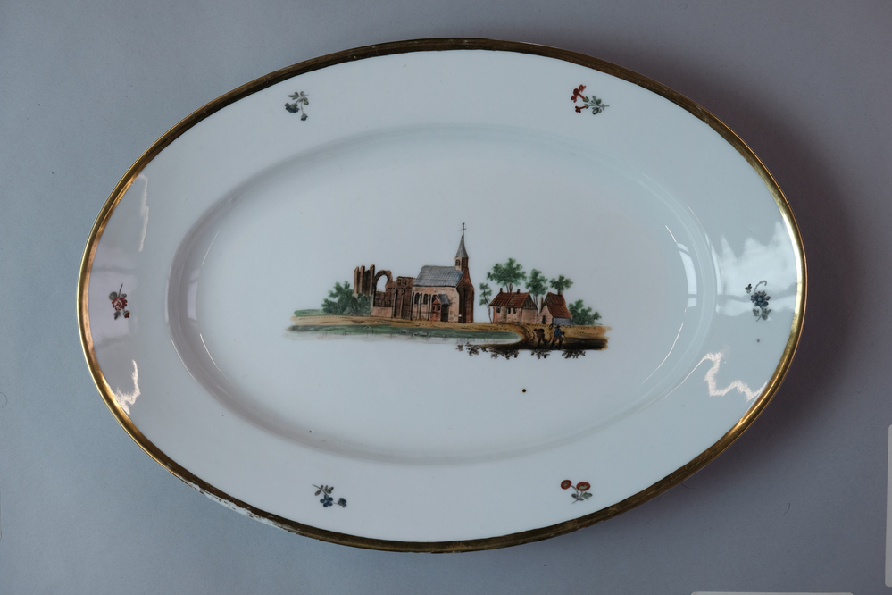 Middelgrote ovale schaal met een afbeelding van een historisch dorpsgezicht of gebouw.- Trefwoorden