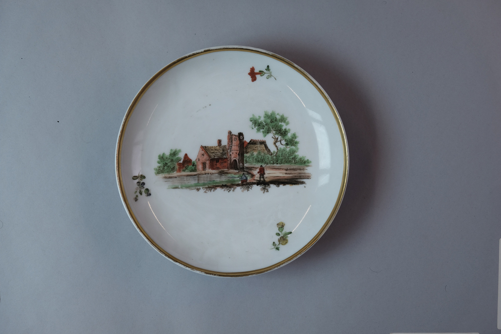 Ronde schaal met een afbeelding van een historisch dorpsgezicht of gebouw.- Trefwoorden