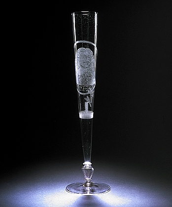 Helder kleurloos glas. Platte voet met omgeslagen rand. Holle balusterstam met twee schijven. Hoge conische kelk. Op kelk medaillon waarin het portret van keurvorst Frederik Willem van Brandenburg en het opschrift: Frederico Guijljelmo D.G./ Marchion brandenbur./ Elect. S.R. Imp. e.v./. Op andere zijde een afgekapte boom met ontspruitende jonge loot op een doorlopend grondje.
