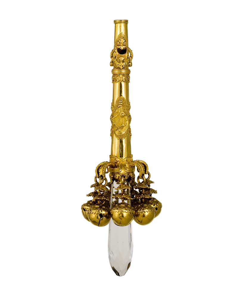 Gouden rammelaar met fluitje en scharnierend ringetje, cilindrische taps toelopende as met opgelegde rocailles en rozetten. Zeven palmetvormige consoles waaraan twee rijen van rozetjes met belletjes hangen waarvan de bovenkant versierd is met bladmotief op een gegranuleerde grond. Bijtstuk van facet geslepen bergkristal.