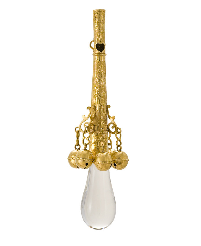 Gouden rammelaar met fluitje, staafvorm bewerkt met rocailles, zes consoles met afhangende bellen en een fluitje met hartvormige opening en ringetje aan de achterzijde. Druppelvormig bijtstuk van geslepen bergkristal.
