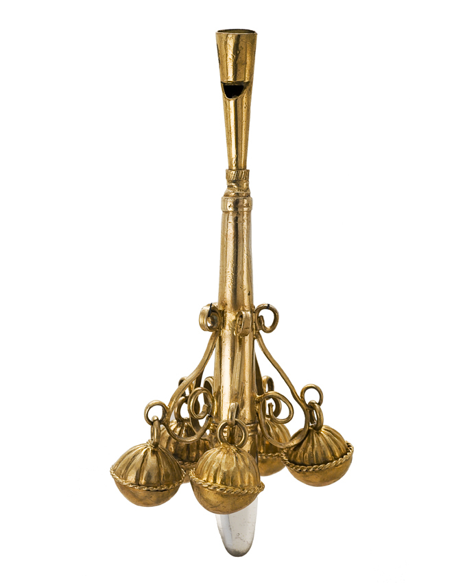 Rammelaar van verguld zilver en fluitje, staafvorm, slank conische as en apart ingezette taps toelopende fluit en rondom S-voluten met geribte belletjes met kabelrandje over het midden. Bijtstuk van kristal.- Trefwoorden
