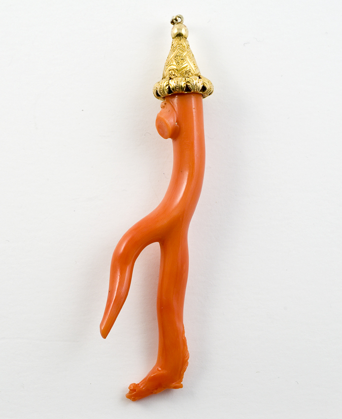 Bijtstuk van bloedkoraal met vertakkingen en de onderkant gesneden in de vorm van een paardenhoofd met golvende manen. De trechtervormige zetting is van rijk bewerkt goud en omgebogen acanthusbladeren en heeft een glad bolknopje met ringetje.