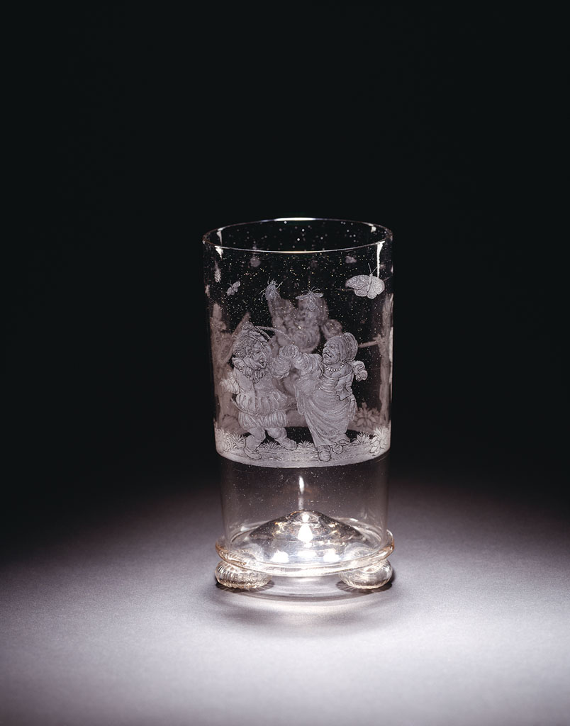 De graveringen op de beker gaan terug op prenten van François Collignon (1611-1685) naar Stefano della Bella (1610-1664) uit de serie 'Facetieuses inventions d'Amour et de Guerre Pour le divertissement des Beaux Esprits' (Rijksprentenkabinet, Amsterdam, inv. nrs RP-P-OB- 42.865, RP-P-OB-42.867, RP-P-OB-42.875). Zie voor een fluitglas met een stilistisch verwante glasgravure van dwergen: Veiling Sotheby's 1986, nr 165, afb. 165. Zie voor een roemer met identieke diamantgravures in de voormalige collectie F. Biemann te Zürich: Baumgärtner 1988, pp. 2822-2823, afb. 2. Het niet bijpassende deksel wordt thans apart bewaard. ( Bert Vreeken)