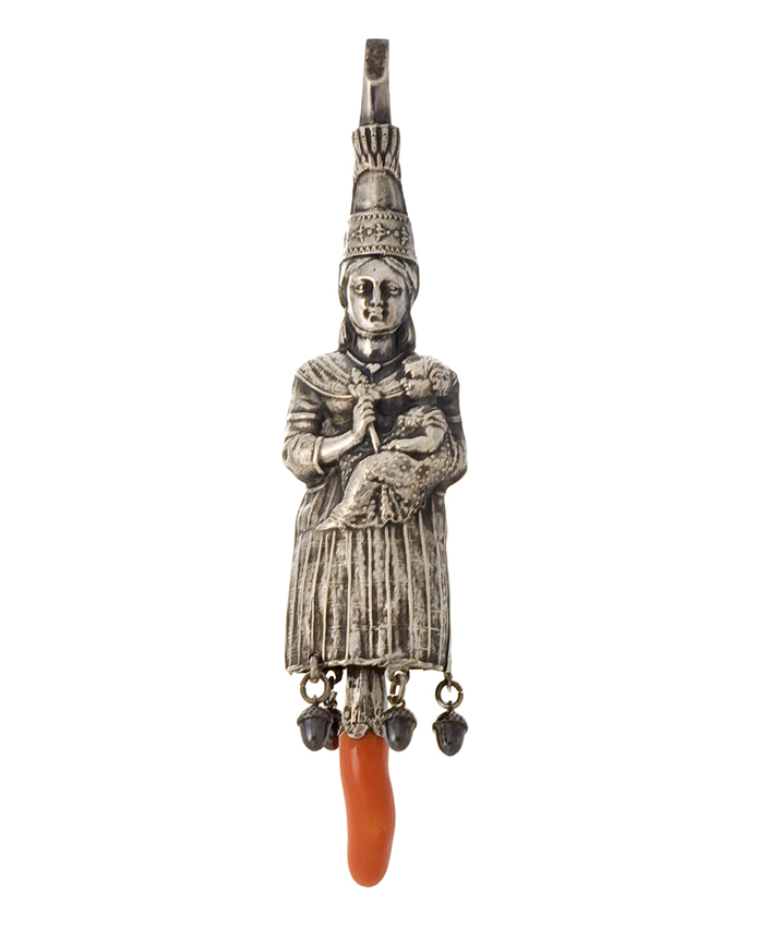 Zilveren rammelaar met fluit in de vorm van een vrouw in klederdracht met kind op de arm die zij een polichinellepoprammelaar voorhoudt. Bellen langs rokzoom. Bijtstuk van bloedkoraal. Fluitje boven hoofdtooi.