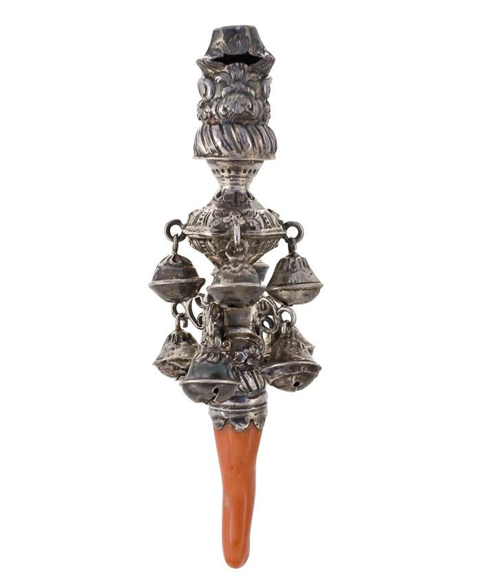 Zilveren rammelaar met fluit met sporen van verguldsel. Dubbelconische nodus en gedecoreerd met schuine knerranden en symmetrische bloemmotieven en twee boven elkaar hangende rijen van bellen. Geschulpte zetting voor het bijtstuk van bloedkoraal.