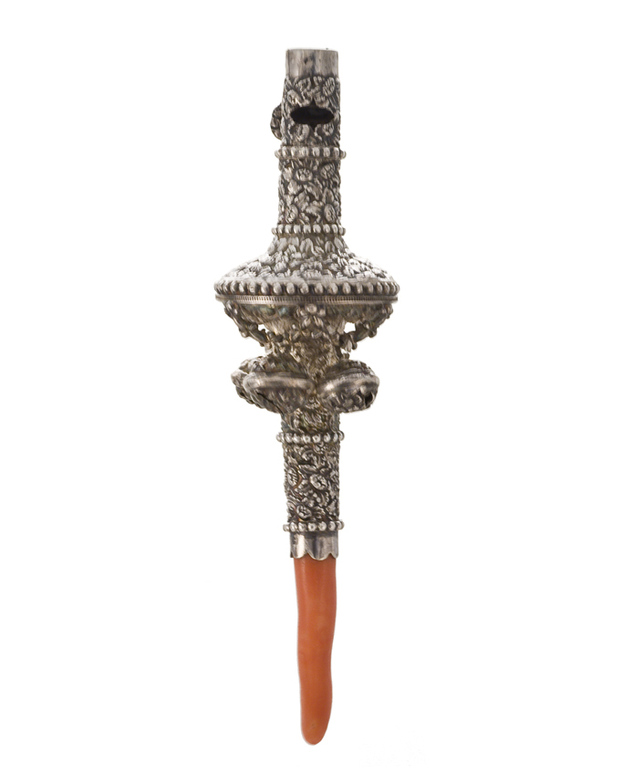 bruikleen 2025-10-20 inv.nr. HK 0140 in depot Zilveren rammelaar met fluit, rijk bewerkt met rond het dubbel conische middendeel vier bellen aan guirlandes. Bijtstuk van bloedkoraal.