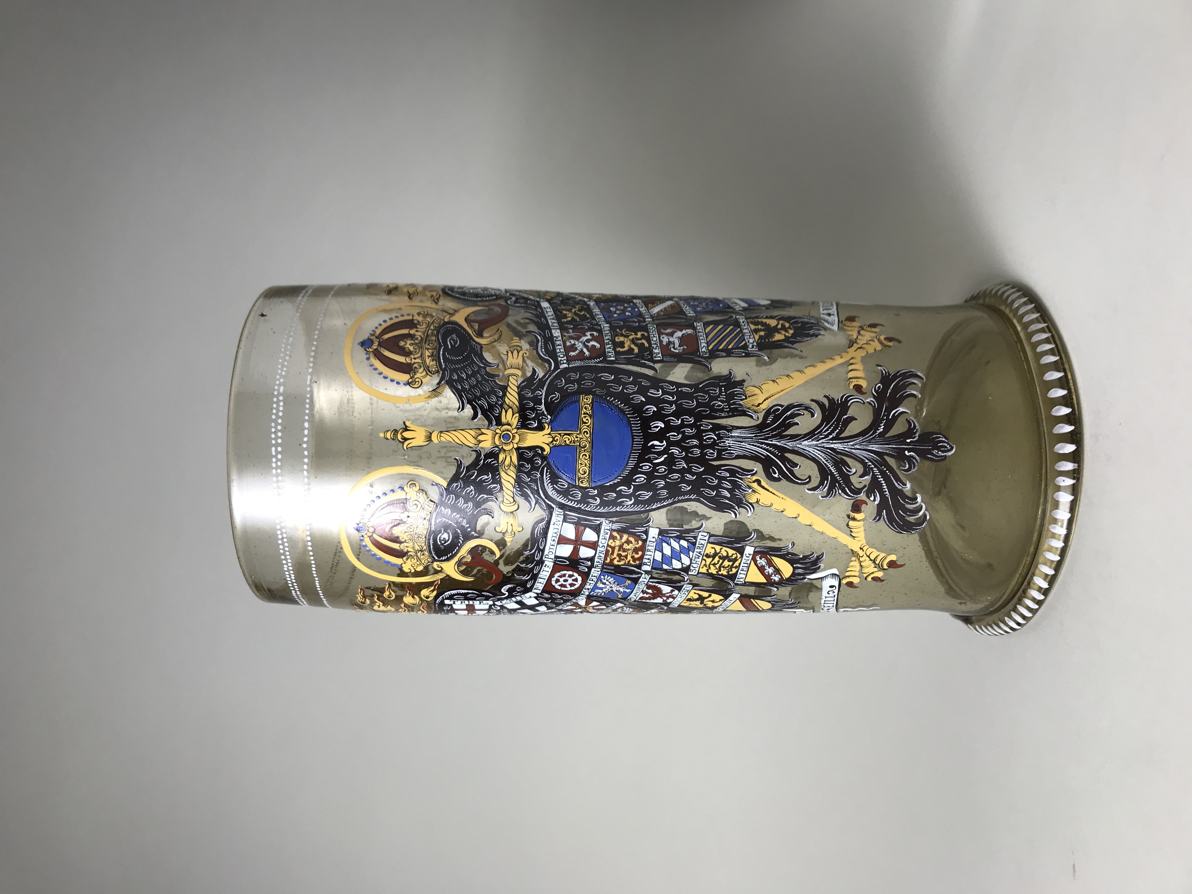 Helder geelgroen glas. Ingestoken bodem. Standring. Cilindrisch lichaam. Op lichaam een gekroonde tweekoppige adelaar met gespreide vleugels waarop de zesenvijftig wapens van de Quaterniones Imperii, de wapens van de Duitse keurvorsten, vorsten, rijksstanden en steden. Voor de borst de rijksappel met kruis. Bovenin de vleugels, horizontaal geordend, de wapens van de keurvorsten met opschriften. Links de kerkelijke: TRIER/ CÖLLN/ MENTZ/ POTESTAT ZV RO[M]/, rechts de wereldlijke: BÖHEM:/ PFALTZ/ SACHSSEN/ BRANDENBVRG/. Hieronder, in telkens zes verticale rijen, elk met tekstlint en verklarend opschrift, de wapens van de Quaterniones Imperii, van boven naar beneden, van links naar rechts: CÖLLN/ REGENSBR/ COSTNITZ/ SALTZBVRG/ met het tekstlint: 4: PAVRN/. AVGSPVRG/ METZ/ AACH/ LVBECK/ met het tekstlint: 4: STETTE/. LVNTPVRG/ WESTERBVR/ THVSSIS/ ALWALDEN/ met het tekstlint: 4 SEMPERFREIN/. NVRNBERG/ MAIDBVRG/ REINECK/ STRAMBERG/ met het tekstlint: 4 BVRGGRAVEN/. MAEHREN/ BRANDENBVRG/ MEICHSSEN/ BADEN/ met het tekstlint: 4 MARGGRAVEN/. BRAVNSCHWEIG/ BAIRN/ SCHWABEN/ LVTRING/ met het tekstlint: 4 SEILL/. Aan andere zijde van adelaar: BRABANDT/ N.SACHSSN/ WESTERREICH/ SCHLESSY/ met het tekstlint: 4. VICARI/. PFALTZ/ DVRING/ EDELSAS:/ HESSEN/ LVBECK/ met het tekstlint: 4: LANTGRAVEN/. CLEVE/ SAPHOY/ SCHWARTZBVR/ ZILLY/ met het tekstlint: 4: GRAVEN:/. ANDELAV/ WEISSENBACH/ FRANBERG/ STRVDECK/ met het tekstlint: 4: RITTER/. BAMBERG/ VLM/ HAGENAV/ SLETSTADT/ met het tekstlint: 4: DÖRFFER/. MAGDABVRG/ LVTZELBVRG/ ROttenBürG/ ALDENBVRG/ met het tekstlint: 4 BIRG/. Boven elke vleugel een Bourgondische vuurslag. Op achterzijde in wit email het opschrift: Daß Heillige/ Römische Reich/ Mitt Sampt/ Seinen Gliedern/ 1659./. De opschriften in gotische letters. Rondom bovenzijde lichaam sporen van vergulde band tussen witte stippellijnen, de bovenste dubbel. Op standring stippen in wit email.