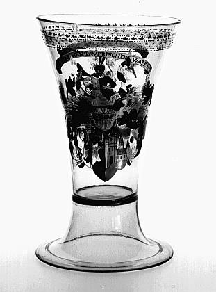 Helder kleurloos, grijs getint glas. Vlakke bodem. Hoge concaaf-conische voet met omgeslagen rand. Conische, uitbuigende kelk. Op kelk een niet geïdentificeerd wapen. Hierboven het opschrift: DER KIRCHEN:PAVERISCHEN WAPE./. Op andere zijde een tweede, evenmin geïdentificeerd, wapen, waarboven het opschrift: DER ALTHOFISCHEN.WAPEN/. De opschriften met zwarte letters in witte banderol. Rondom bovenzijde kelk een band met vergulde schubben en blauwe stippen tussen dubbele rode en blauwe stippellijnen en gestileerde bladmotieven. Vergulde band op overgang voet en kelk.