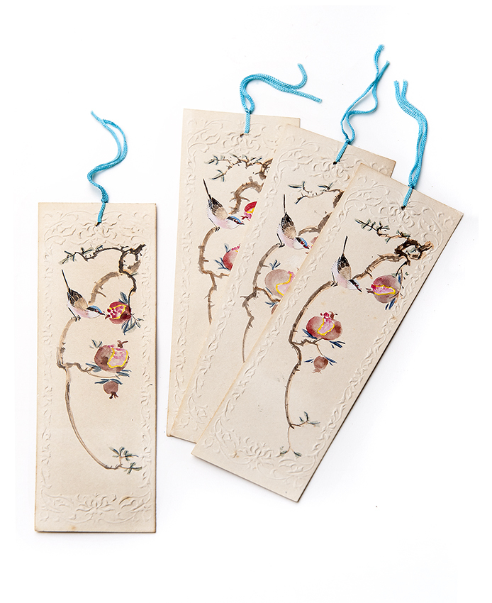 - Vier kartonnen boekenleggers beschilderd met vogels en granaatappels, 1900 - 1988