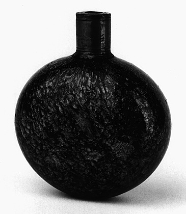 Bruinrood aventurijn glas. Afgeplat bolvormig lichaam met korte hals. Hals gevat in getand zilveren montuur met gegraveerde dubbele filetrand.- Trefwoorden