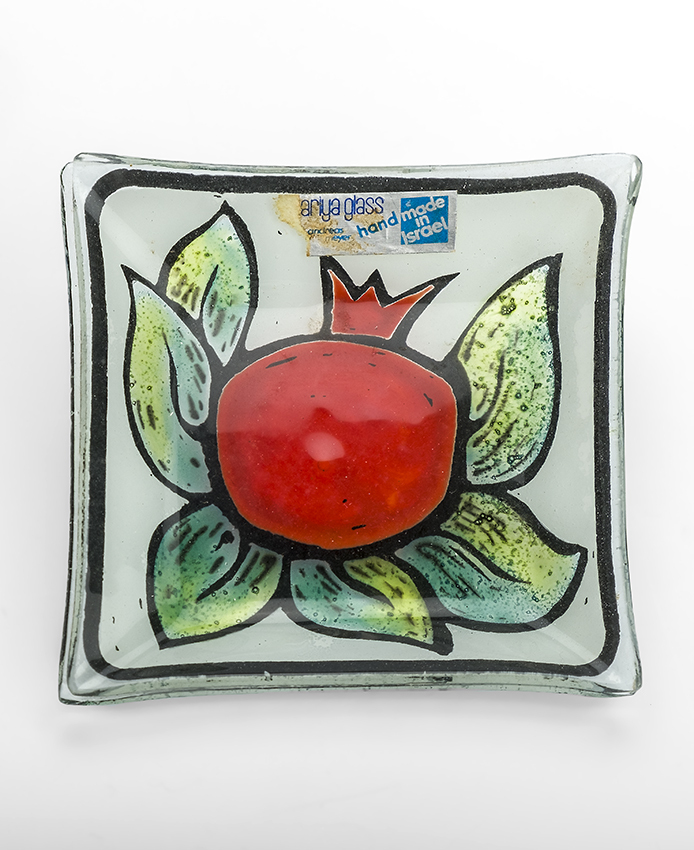 bruikleen 2025-10-20 inv.nr. HK 0721 in depot Twee vierkante en één ronde geglazuurde schaal in verschillende formaten, handbeschilderd met een rode granaatappel op witte ondergrond.
