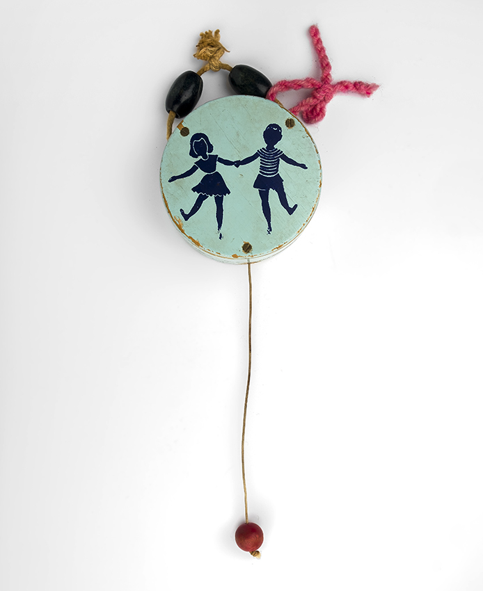 Houten schijfvormig speeldoosje, blauw geschilderd en aan de voorzijde voorzien van twee hand in hand dansende kinderen. Aan de onderzijde hangt een touwtje dat is verbonden aan het mechaniekje binnenin, aan de bovenzijde een touwtje met twee blauwe kralen waarmee het speeldoosje kan worden opgehangen.- Trefwoorden