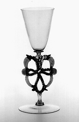 Helder kleurloos, geel getint glas, helder blauw glas, opaak wit, rood en geel glas. Platte voet. Basisschijf. Stam met geribde en gedraaide buis met dubbele witte, rode en gele glasdraden. Twee kammen van blauw glas met geknepen wafelpatroon. Schijf. Conische kelk met afgeronde basis.