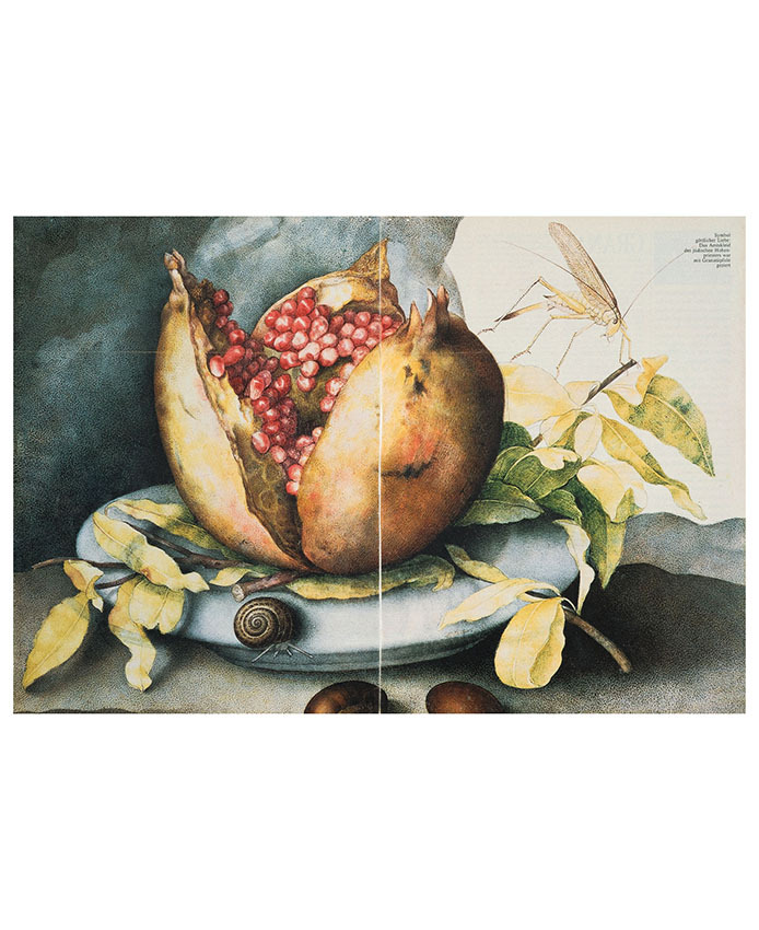 Ingelijst drukwerk met afbeelding van een opengebarsten granaatappel op een bordje met daaromheen insecten.