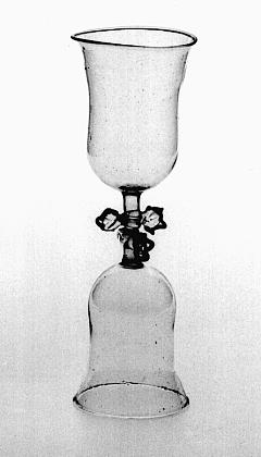 Helder kleurloos glas, helder blauw glas. Twee tegenovergestelde klokvormige kelken, verbonden door stam met vier geknepen kammen en blauwe glasdraad.- Trefwoorden