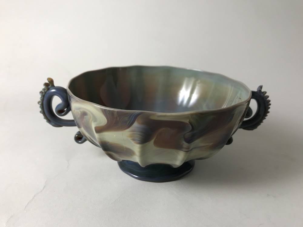 Bruin-groen-geel gemarmerd agaatglas. Concaaf-conische voet. Wijde kelk met in de vorm geblazen ribbelpatroon. Twee S-vormige oren, de uiteinden ingerold, met geknepen kammen.