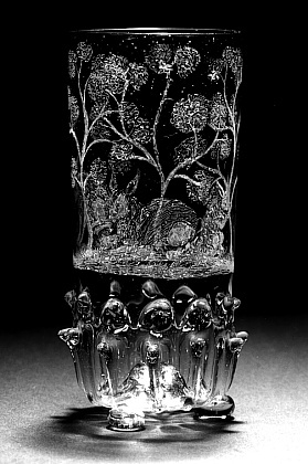 Helder kleurloos glas. Ingestoken bodem op drie knopen. Cilindrisch lichaam, de onderzijde met in de vorm geblazen en uitgetrokken ribben. Rondom lichaam drie hazen en vogeltjes in landschap.