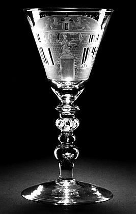 Helder kleurloos glas. Conische voet. Balusterstam met luchtbel, drie knopen en gedraaide luchtbellen. Conische kelk met verdikte basis en luchtbel. Op kelk een gevangenis met Vrouwe Justitia, symbool van de gerechtigheid, en het gekroonde stadswapen van Amsterdam, gehouden door twee leeuwen. Achter het getraliede venster rechts een vrouw met spinnenwiel. Op andere zijde het opschrift: T. WELVAREN VAN T. HUYS/. Gepolijste details.