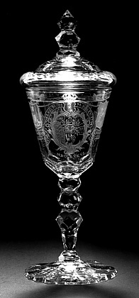 Helder kleurloos glas. Licht conische voet. Basisknoop. Balusterstam met twee knopen. Conische kelk. Onder mondrand in radgravure het opschrift: SALUS. POPULI. SUPREMA. LEX. ESTO./. Op kelk een rococo cartouche waarin het embleem van het Collegium Medicum. Hierboven het gekroonde stadswapen van Amsterdam en in tekstlint het opschrift: COLLEGIUM MEDICUM/. Hieronder in Romeinse cijfers MDCCLXXVI/. Aan weerszijden zes familiewapens van de inspectores van het Collegium Medicum met hun namen en de jaartallen: DR= I= VAN ALPHEN./ 1771./ MR= DK= TIMMER./. 1766./ MR= RS= WS= LS DE RHOER./ 1773./ DR= PS= VAN LEENDT/ 1753./ DR= C= I= DE FAMARS./ 1748./ DR= IAN HANEDOES./ 1732./. Gewelfd deksel met samengestelde knop. Voet, basisknoop, balusterstam, basis kelk en deksel deels gefacetteerd. Gesigneerd en gedateerd op voet in diamantgravure: Jacob Sang/ Fec: 1776.