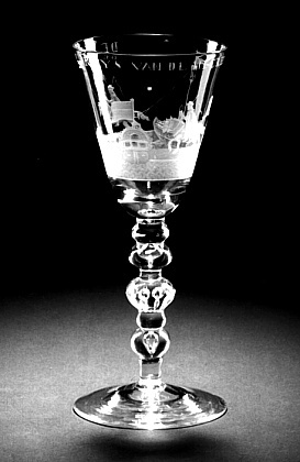 Helder kleurloos glas. Licht conische voet. Balusterstam met vijf knopen en dubbele rij luchtbellen. Conische kelk met afgeronde basis. Rondom kelk twee trekschuiten en twee jagers te paard. Hierboven het opschrift: DE GOEDE REYS VAN DE HEEREN/.