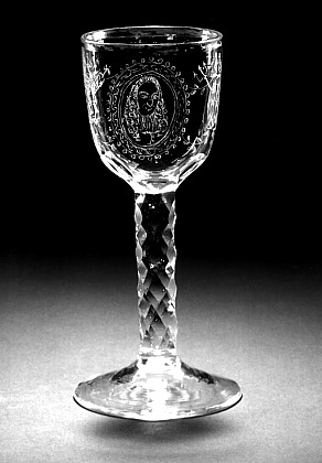 Helder kleurloos glas. Licht conische voet. Gefacetteerde stam. Eivormige kelk, de basis in olijven geslepen. Op kelk een met bladranken omkranst medaillon waarin het portret van Hendrik Hooft Danielsz., burgemeester van Amsterdam. Op andere zijde kelk een rechthoekig schild in neo-classicstische stijl waarin het opschrift: Die uijt geen dwang/ Nog zelfs belang/ Syn sugt tot Vrijheid dooft/ die drinkt ter eer/ der braaven heer/ der burger vader/ HOOFT./ Vergulde band onder mondrand.