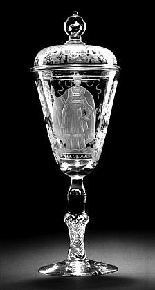 Helder kleurloos glas. Licht conische voet. Basisknoop. Gefacetteerde balusterstam met knoop, luchtbel, gedraaide luchtspiralen en loden ring. Conische kelk met afgeronde basis. Op kelk een bisschop met mijter, staf en boek, waaronder het opschrift: St NICOLAAS/. Aan weerszijden paarsgewijs geordend de vier familiewapens van de regenten van het Leprozenhuis. Op andere zijde kelk een leprozenklepper, het symbool van het gesticht, met daaronder een collecteschaal. Gewelfd deksel met bolvormige knop en luchtbel. Op deksel tussen bloemkransen dezelfde familiewapens, het stadswapen van Amsterdam en het koggeschip. Gepolijste details.