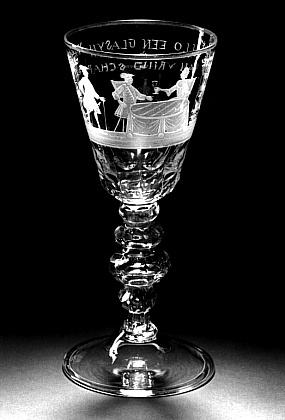 Helder kleurloos, grijs getint glas. Concaaf-conische voet met omgeslagen rand. Stam met vier knopen en langgerekte luchtbel. Conische kelk met afgeronde basis. Stam en basis kelk in facetten geslepen. Op kelk een aan tafel gezeten paar, de dame het glas heffend. Links een staande heer, aan weerszijden een mand met bloemen. Op andere zijde het opschrift: ALLO EEN GLASYN/ VAN VRIND SCHAP/.