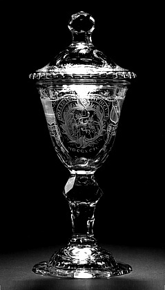 Helder kleurloos glas. Gewelfde voet met geschulpte rand. Basisknoop. Balusterstam. Conische, licht uitbuigende kelk met afgeronde basis. Op kelk een rococo cartouche waarin een slang rond een spatel met geneeskrachtig kruid, het embleem van het Collegium Medicum. Hierboven het gekroonde stadswapen van Amsterdam, geflankeerd door het opschrift: COLLEGIUM./ MEDICUM./. Onder cartouche het jaartal: MDCCXCIV=/. Aan weerszijden van het embleem elk drie familiewapens van de Inspectores van het Collegium Medicum met de namen en jaartallen: DR. A= BONN./ 1789./ D=N= VAN DER EEM./ 1794./ D=H= POST./ 1794./ I= FRESCARODE./ 1788./ DR. F=E= WILLET./ 1791./ DR. H=G= OOSTERDIJK./ 1779./. Gewelfd deksel met bolvormige knop. Rondom deksel bloem en bladmotieven. Voet, stam, basis kelk, deksel en knop in facetten en olijven geslepen. Gepolijste details.