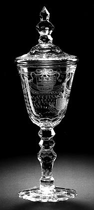 Helder kleurloos glas. Licht conische voet met geschulpte rand. Basisknoop. Balusterstam met twee knopen. Conische kelk met afgeronde basis. Rondom kelk vier familiewapens van de regenten van het Leprozenhuis met de namen: DE HR REINIER IAN VAN DEN BROEK/ DE HR DANIEL NOLTHENIUS/ DE HR ISAAC VEENING./ DE HR MATTHYS VAN SON/. Op onderste deel kelk een familiewapen met de naam: HENDRIK VAN VEEN./ en het opschrift: TER 25-IAARIGE GEDAGTENIS, VAN HENDRIK VAN VEEN,/ ALS BOEKHOUDER VAN T' LEPROSENHUYS DER/ STADT AMSTERDAM, ISDEESE BOECAAL/ AAN T' HUYS PRESENT GEDAAN,/ DEN 8 STE IANUARY 1774./. Gewelfd deksel met samengestelde knop. Rondom deksel bloem- en bladmotieven. Voet, stam, basis kelk en dekselknop in facetten geslepen. Gepolijste details.