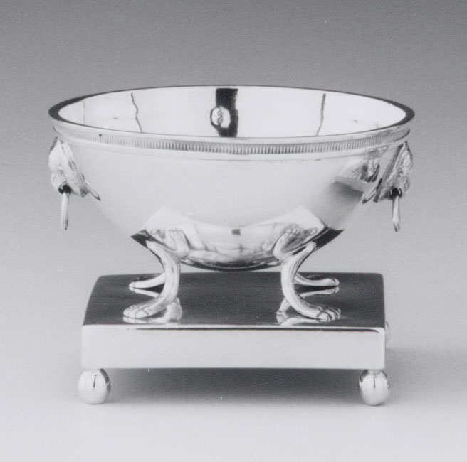 Zoutvat met vierkant voetstuk, op vier bolvormige poten en komvormig vaatje op vier klauwpoten. Aan weerszijden vat een leeuwenmasker met ringetje, als grepen dienend. Geribde band tussen gladde randen langs bovenrand. Binnenzijde vaatje verguld. Op onderzijde voetstuk in graveersteek: V/.