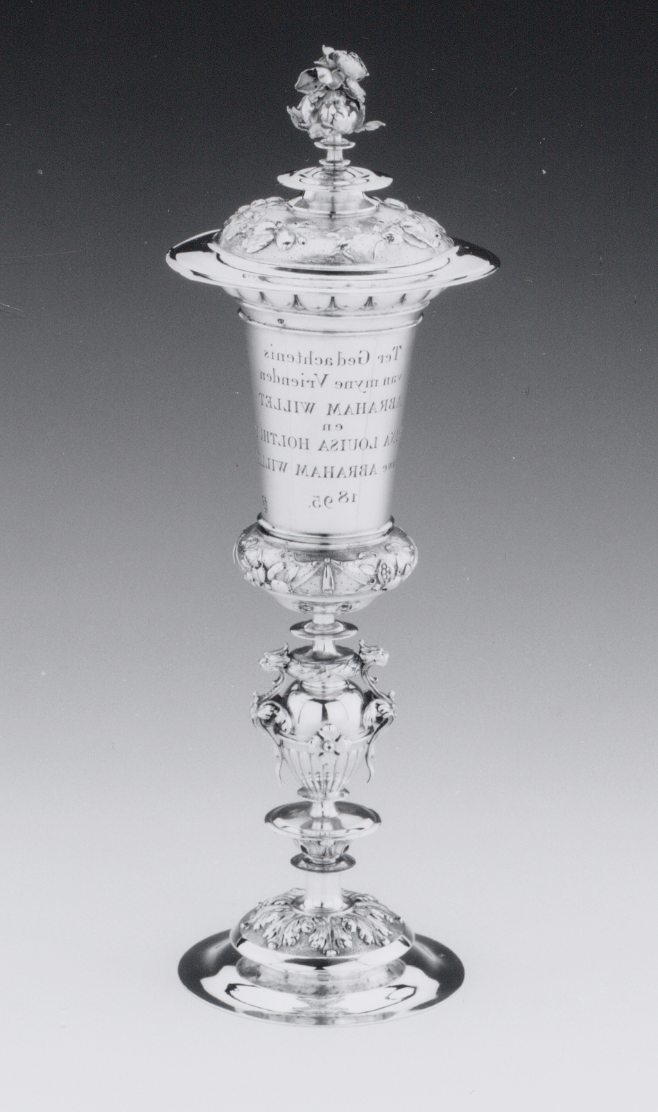 opschrift voorzijde kelk: Ter Gedachtenis/ van myne Vrienden/ ABRAHAM WILLET/ en SANDRINA LOUISA HOLTHUYSEN/ weduwe ABRAHAM WILLET/1895./: Ter Gedachtenis/ van myne Vrienden/ ABRAHAM WILLET/ en SANDRINA LOUISA HOLTHUYSEN/ weduwe ABRAHAM WILLET/1895./
