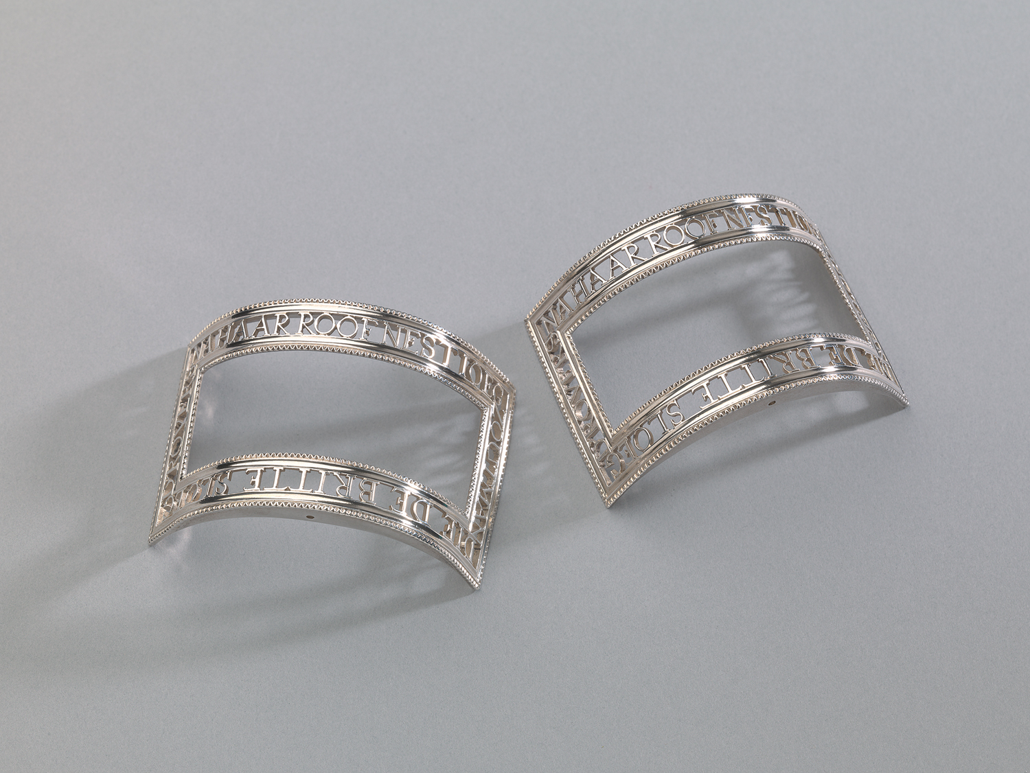 Twee gebogen rechthoekige gespen, elk met opengewerkte rand met het opschrift: ZOUTMAN/ DIE DE BRITTE SLOEG/ D'ROVERS/ NA HAAR ROOFNEST IOEG/, tussen profiel- en parelranden.