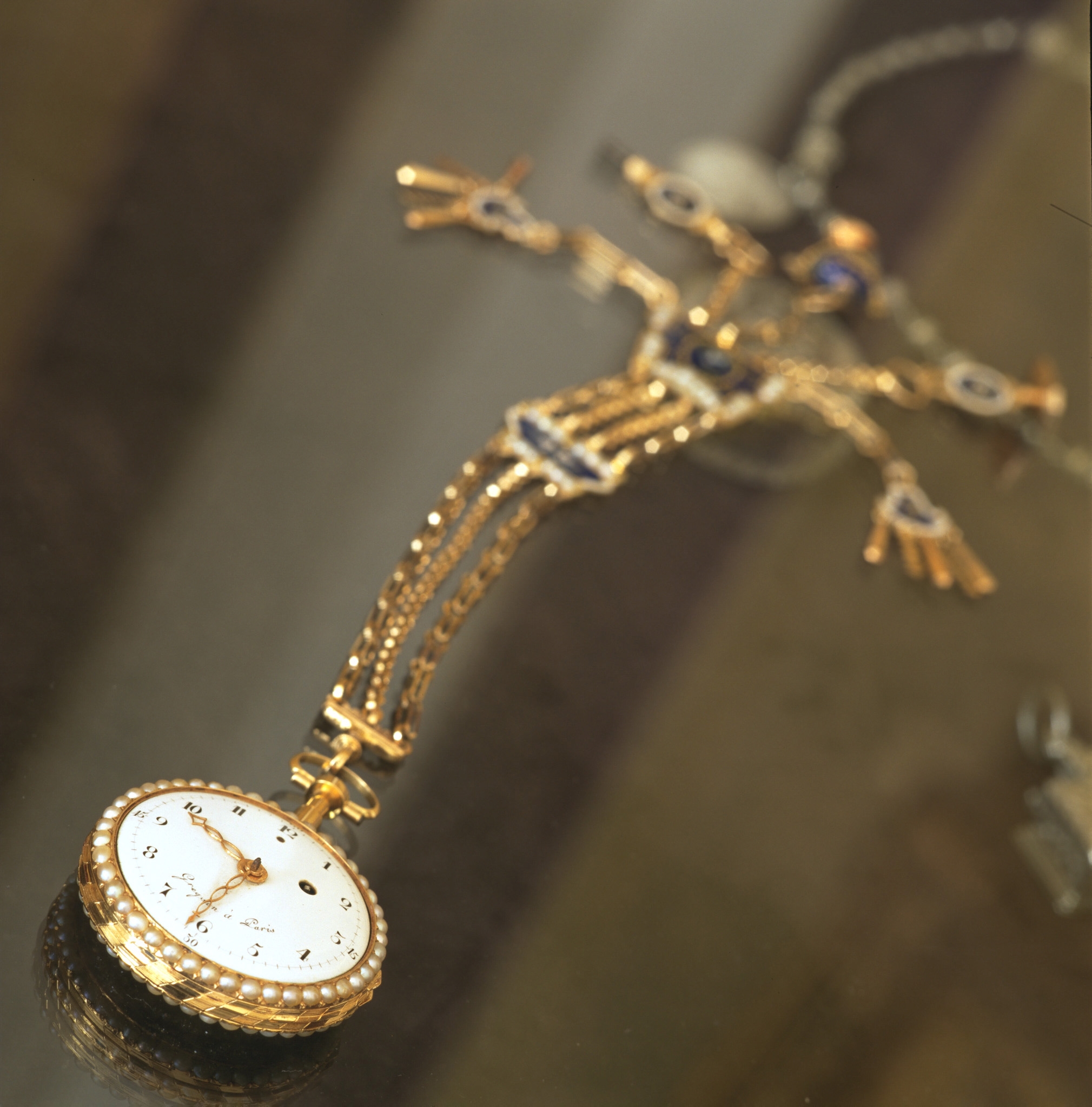Tweezijdige gouden chatelaine samengesteld uit meerdere kettingen, bedoeld om rond de gordel van een dame gedrage te worden. Gedeeltelijk met blauwe en witte email versierd. Op de verbindingsstukken parels en een voorstelling met de tekst: Gage d'amittie' (teken van vriendschap). Het horloge gesigneerd Gregson a Paris, met op de keerzijde een emaille-voorstelling van een de godin van de liefde met twee duiven. Met origenele rood lederen etui.