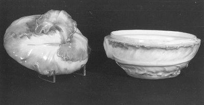 Doosje heeft ovale vorm, in de vorm van een kool, in de kleuren wit, lichtgroen en paars-rose; een opgekruld blad als knop van het deksel.- Trefwoorden