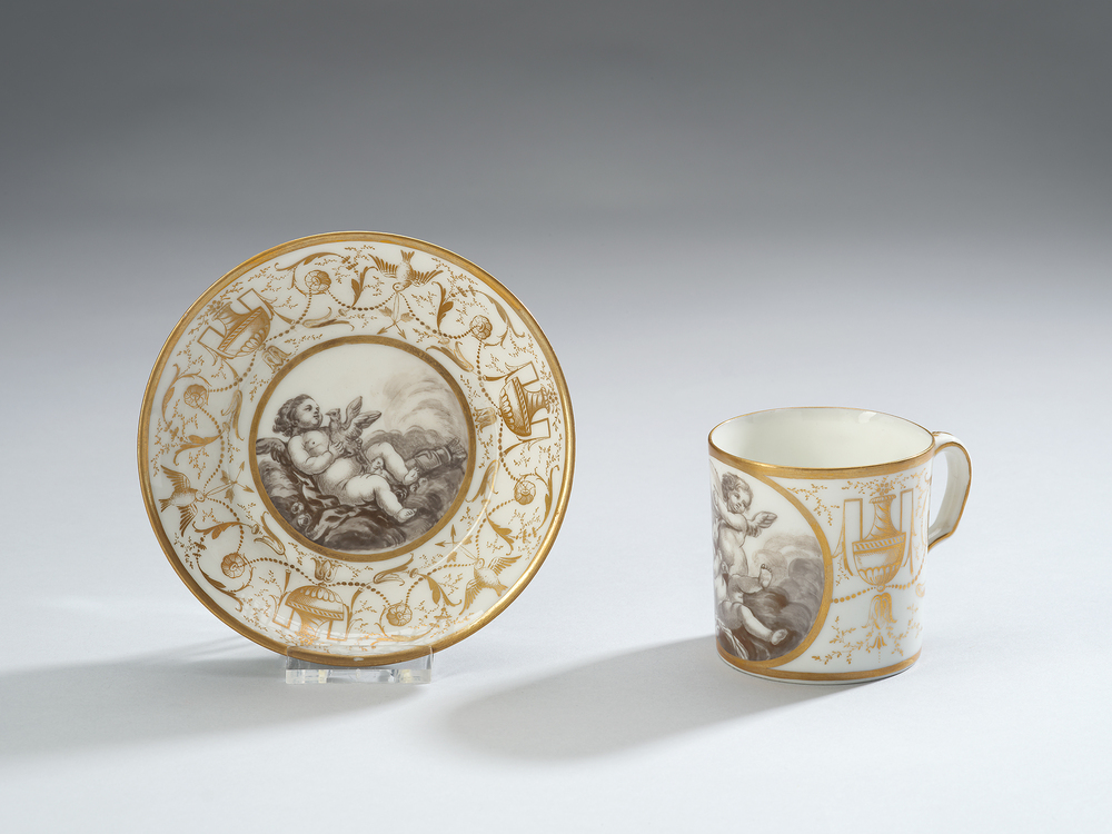 Ronde kop met ovaal oor; de schotel is diep, beide met een brede vergulde lambrequin rand met vazen en vogels, en ronde grisaille medaillons met musicerende putti op wolken.