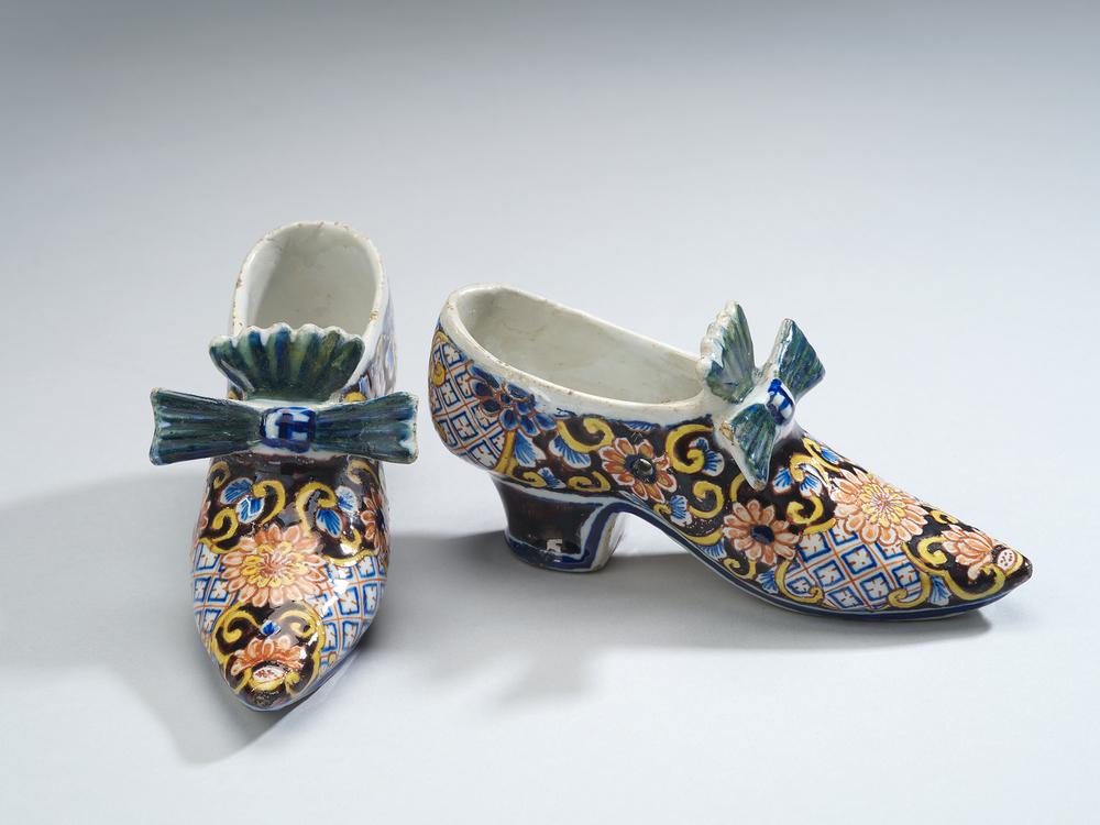 Paar schoenen, onderglazuur in paars, bruin, blauw, geel en groen, decor met bloemvoluten en ruitjes patroon, iedere schoen heeft een blauw, groene strik.- Trefwoorden