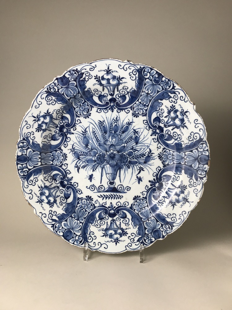 Rond model met geschulpte rand, blauw decor, in het midden vaas met bloemen en insecten, op de rand vruchten in bak, voluten en bloemen.- Trefwoorden