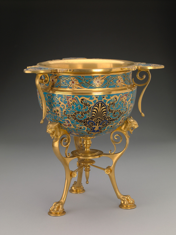 - Voorwerpen van verguld brons, ingelegd met kleurig émail cloisonné waren in de jaren zestig van de negentiende eeuw zeer gewild. De pendule in de zaal beneden is in dezelfde decoratietechniek uitgevoerd.