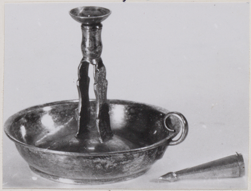 Ronde schotel met greepje en kaarsenhouder, losse bobeche en dover.